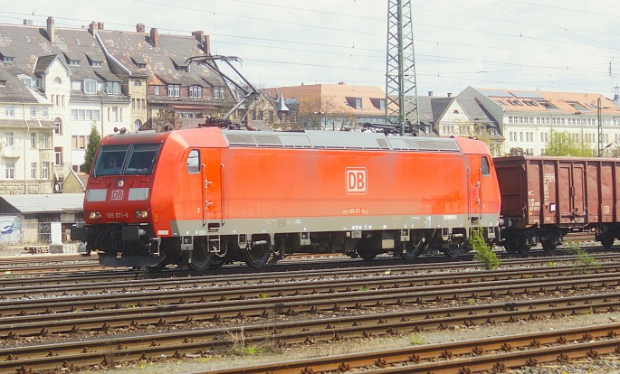 Das Bild zeigt die 185 071-8 im Vorfeld des Hbf. Fürth. Eine Lok der ersten Generation. copyright J.Franke