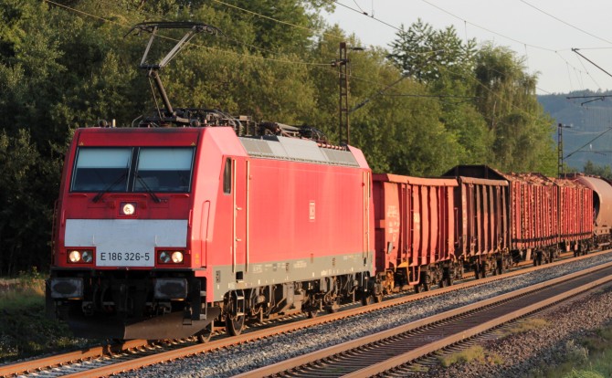 Die 186 323-2 zieht 2014 einen Zug aus Schienentransportwagen durch das schöne Maintal. copyright: Marco Löffler