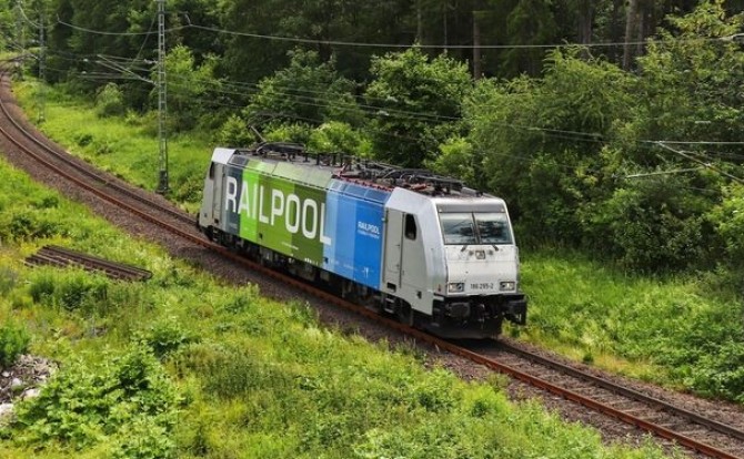 Die Railpool 186 275-4 bringt einen Containerzug von Duisburg nach Stuttgart. copyright: Wolfgang Bügel / Slg. Eisenbahnstiftung